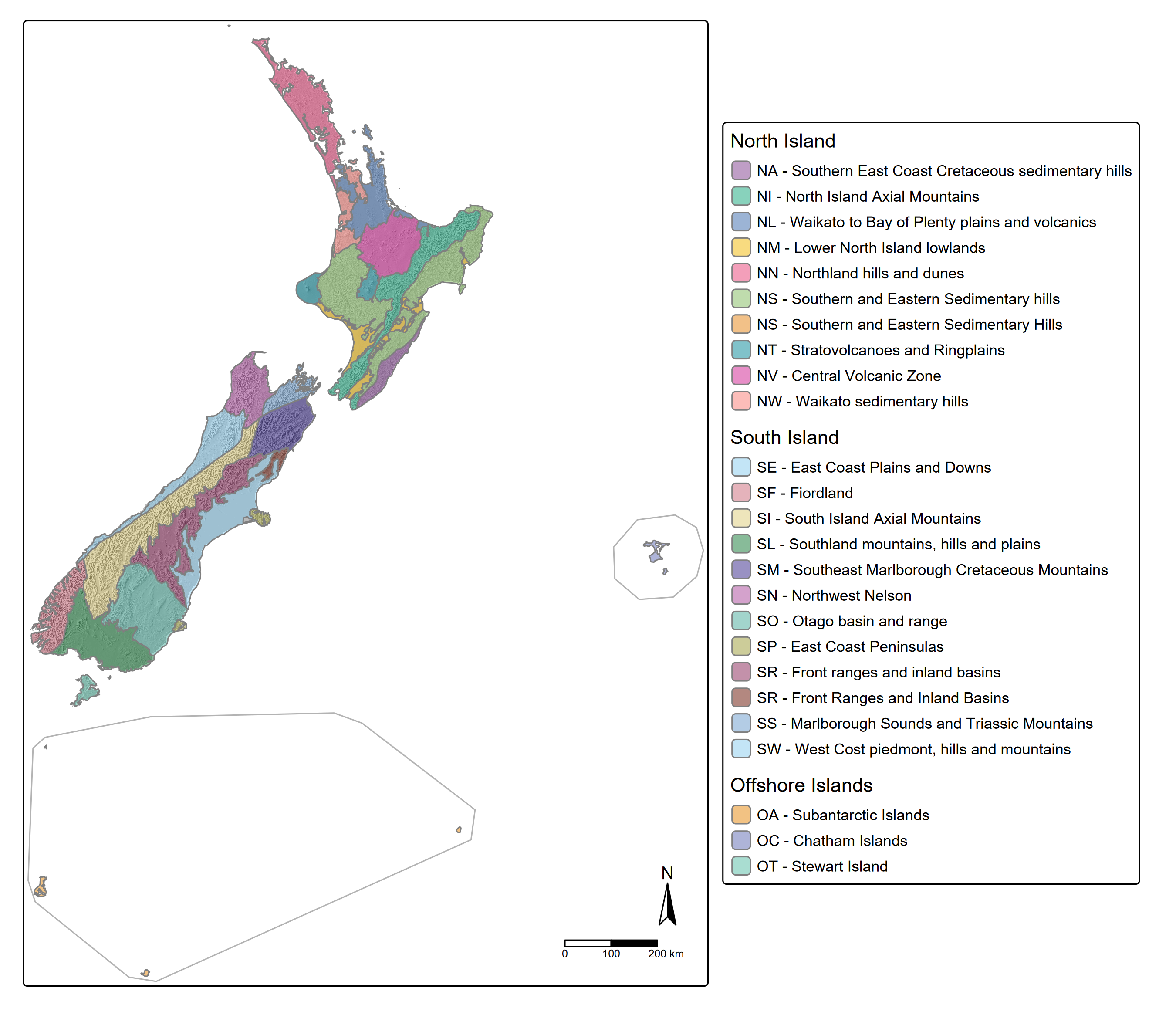 In this system, the chosen scales are Province (Section 3.1), Landscape (Section 3.2), and Landform (Section 3.3) as described below. Provinces are large, continuous regions of New Zealand (and its outlying islands) that have a distinctive character driven mostly by their geology and climate. Within provinces, landscapes describe assemblages of spatially related landforms that may form semi-regular patterns. Within landscapes, individual landforms comprise local expressions of earth, air and water movement over time.