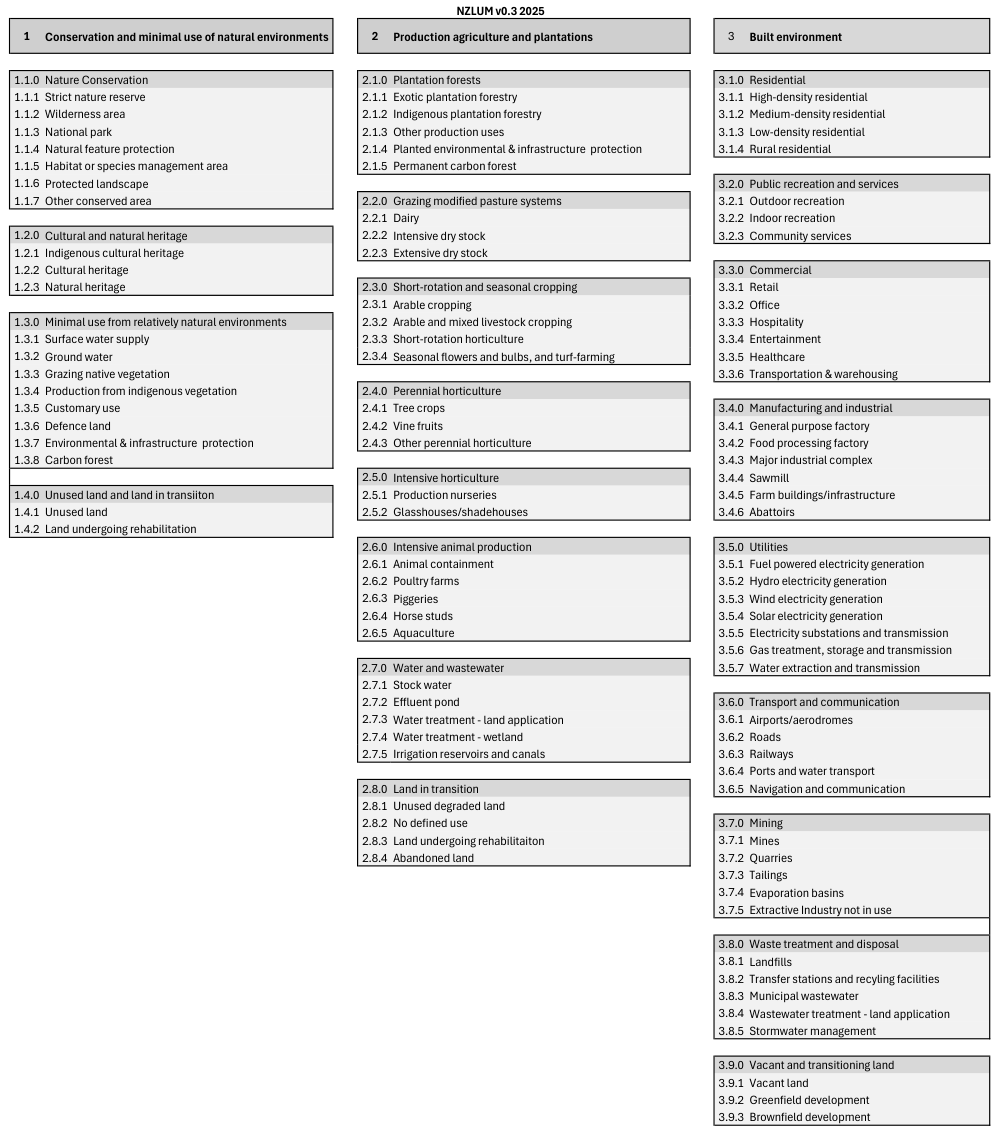 New Zealand currently lacks an official land use classification framework, but a proposal has been developed based on the framework described in Law (2024) and can be implemented during soil survey work. This proposed New Zealand Land Use Management (NZLUM) has three nested levels with increasing specificity (Figure 7.1), and allows for recording further information as ‘attributes’ of the land use (e.g tenure or management practices).