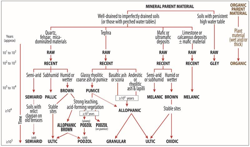 The New Zealand Soil Classification broadly traces the evolution, or genesis, of New Zealand soils through time (Hewitt 1998). Figure 1.1 shows major pathways in the evolution of New Zealand soils. The pathways represent only those likely to have occurred over extensive areas, with many minor pathways or interlinkages omitted for clarity. In mineral parent materials, Raw Soils develop mostly into Recent Soils. The nature of the parent material then strongly determines the subsequent soil genesis pathway. Later, parent material becomes less important, and climate and vegetation, along with time, become more important controls over the character of the soil that evolves (Hewitt 1998; Hewitt et al. 2021).