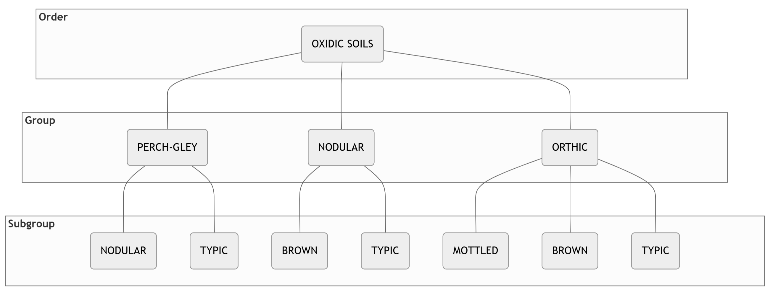 The name given to a soil assigned to a subgroup is made up of three elements in the sequence: subgroup, group, and order (for example, Nodular Perch-gley Oxidic Soils). Note that “Perch-gley”, being hyphenated, is one word, thereby conforming to these nomenclatural rules. Figure 1.2 illustrates the relationships between subgroups and groups in the Oxidic Soils order.